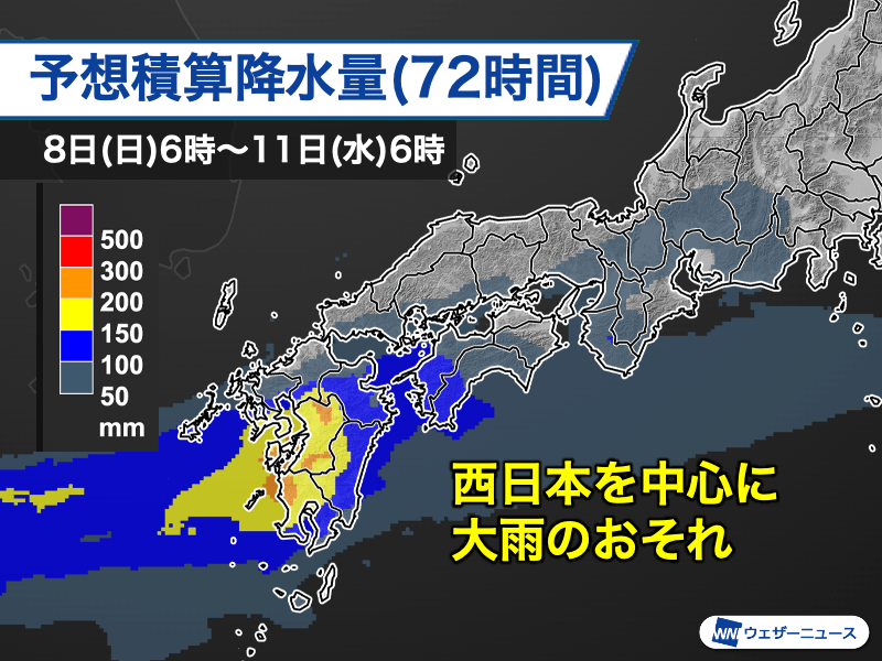 梅雨の時期に見られる大雨のパターンに近く、九州南部は明日から、そのほかの西日本では10日(火)〜11日(水)を中心に雨量が増加する可能性があります。今年はまだ九州南部以外の梅雨入りが発表されていません。梅雨入りして早々に大雨となるおそれがありますので、土日のうちに雨への備えを済ませておくようにしてください。