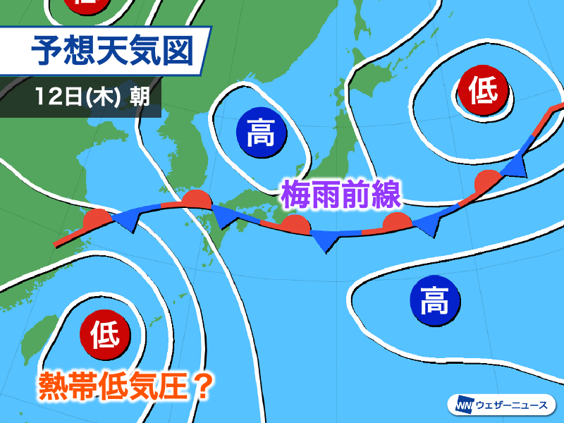 明日の朝には梅雨前線が九州南岸付近まで北上し、九州南部では梅雨空の日曜日になります。また、日中は前線がゆっくりと北上し、来週11日(水)頃にかけて西日本・東日本に停滞する見通しです。西からは前線に沿うような形で、湿った空気が流れ込むとみられます。