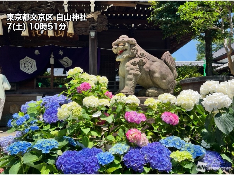 本州付近は西日本で前線帯の雲が広がっている所はあるものの、東日本を中心に日差しが届いています。6月になって紫陽花の色づきが加速し、色とりどりの紫陽花を楽しめる所が増えてきました。