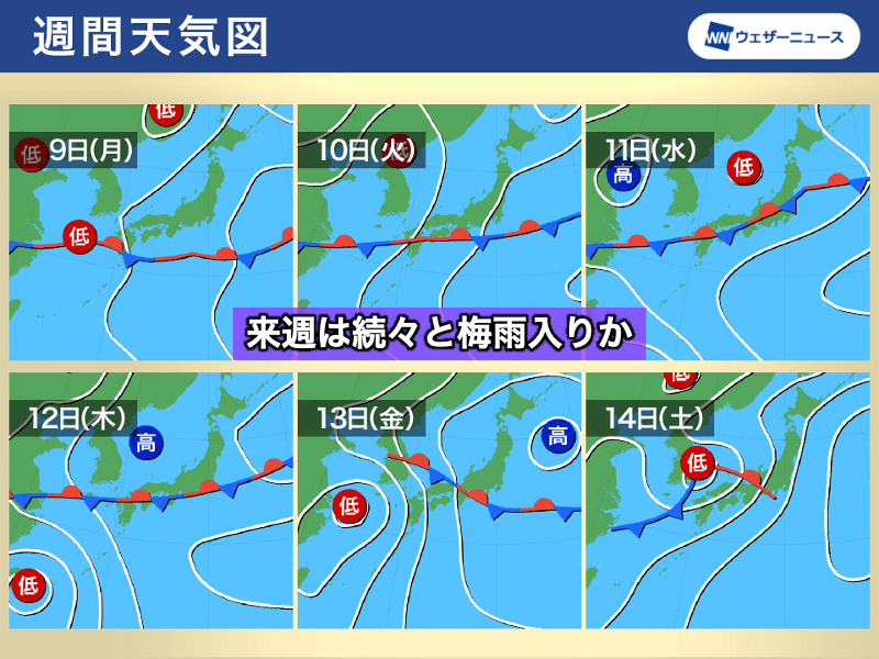 ただ、明日になると太平洋高気圧の勢力が強まるため、梅雨前線がゆっくりと北上して本州に近づいてくる見込みです。来週は梅雨前線がこのまま本州付近に停滞する日が続く見通しで、雨の降り出しに応じて梅雨入りの発表となる可能性が高いとみています。
