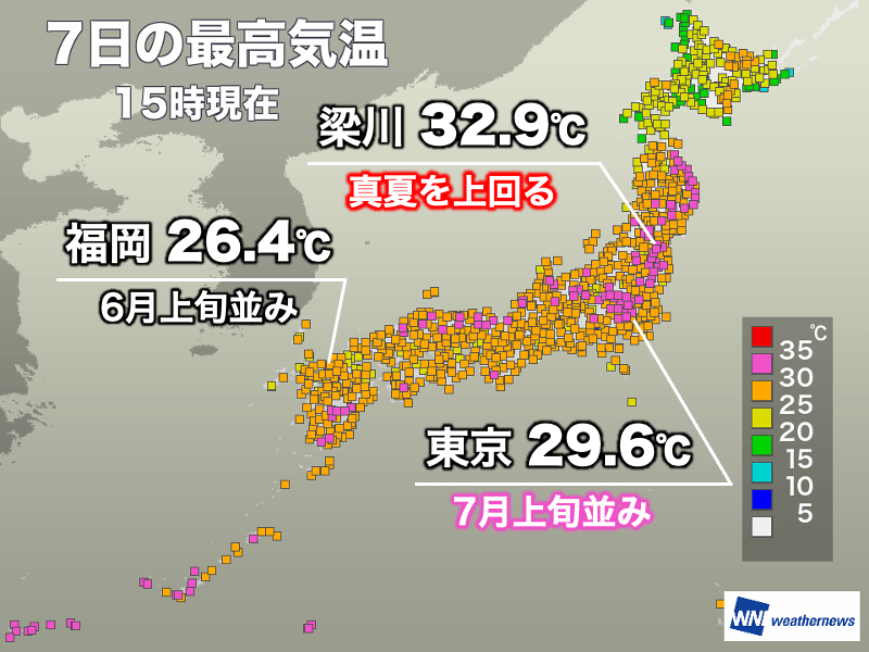 全国で最も気温が高くなったのは福島県伊達市梁川で、13時08分に32.9℃を観測しています。30℃以上の真夏日地点数は15時20分までに110地点になり、5月21日以来の多さとなりました。東京都心は30℃には届かなかったものの、29.6℃と7月上旬並みの暑さです。