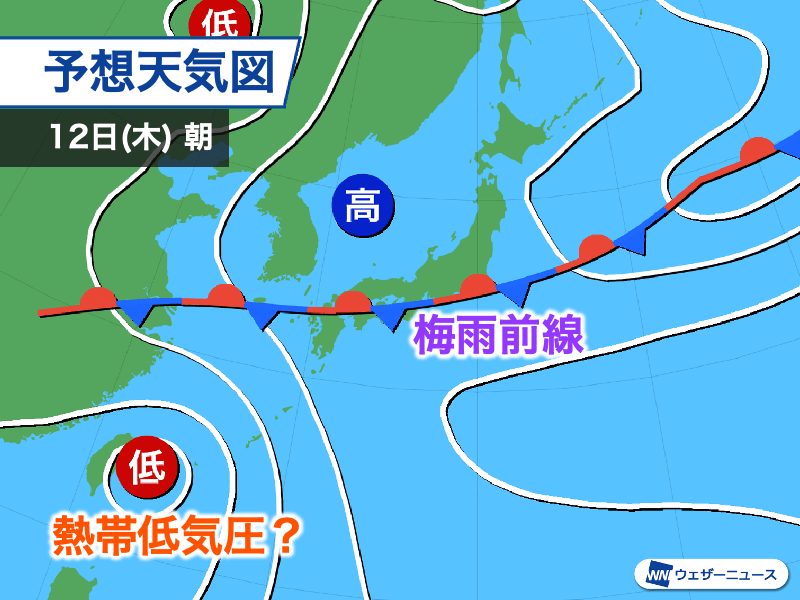 明日の朝には梅雨前線が九州南岸付近まで北上し、九州南部では梅雨空の日曜日になります。日中以降は太平洋高気圧の勢力の強まりに伴って前線がさらに北上し、来週11日(水)頃にかけて西日本・東日本に停滞する見通しです。西からは前線に沿うような形で、湿った空気が流れ込むとみられます。