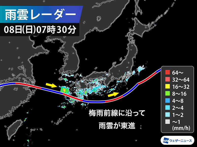 九州南部では局地的に本降りとなっていて、1時間に10〜20mmのやや強い雨を観測しています。