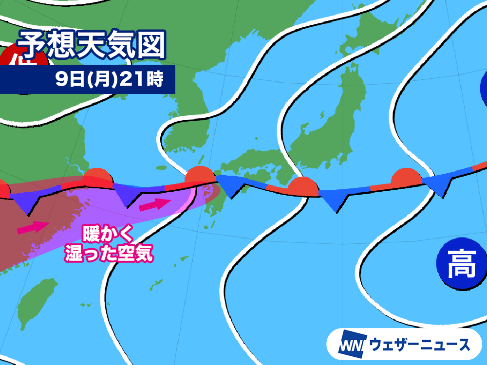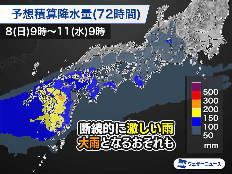 九州では東シナ海側を中心に活発な雨雲が流れ込みやすく、断続的に激しい雨の降るおそれがあります。雨量がかさみ、10日(火)にかけての降水量は200mmを超えるところがある予想です。