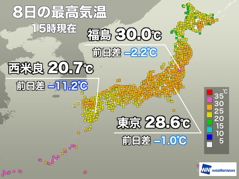 梅雨が明けた沖縄では30℃以上の真夏日の所がほとんどです。南西諸島以外で真夏日になったのは福島県の3地点のみで、昨日よりかなり少なくなりました。
