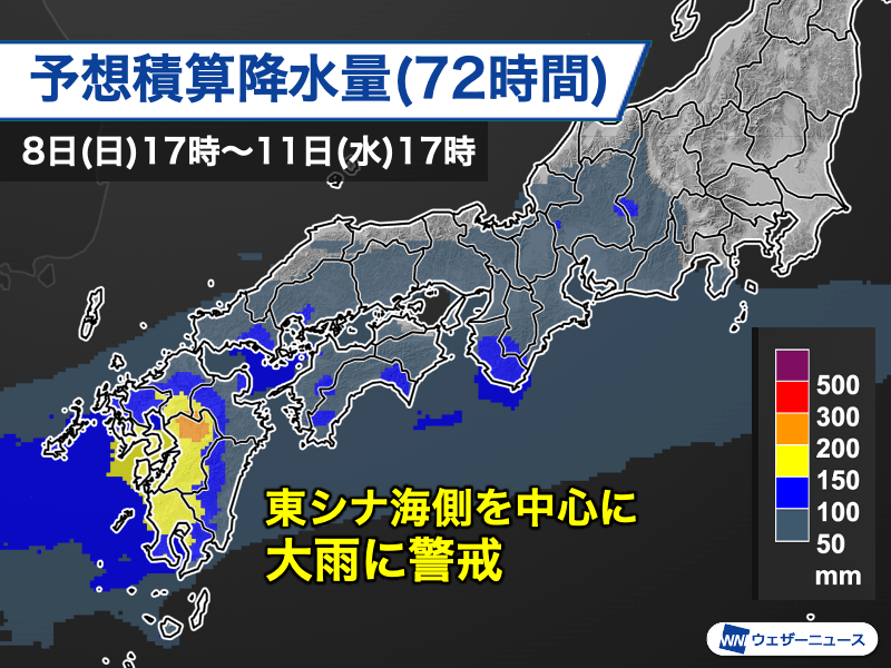 梅雨前線の活動が活発な状態は明後日10日(火)頃まで続く見込みで、多い所では総降水量が200mmを超える予想です。また、週後半も前線の活動が活発になって大雨となる心配が出てきています。今後の情報に注意し、安全を第一に行動するようにしてください。