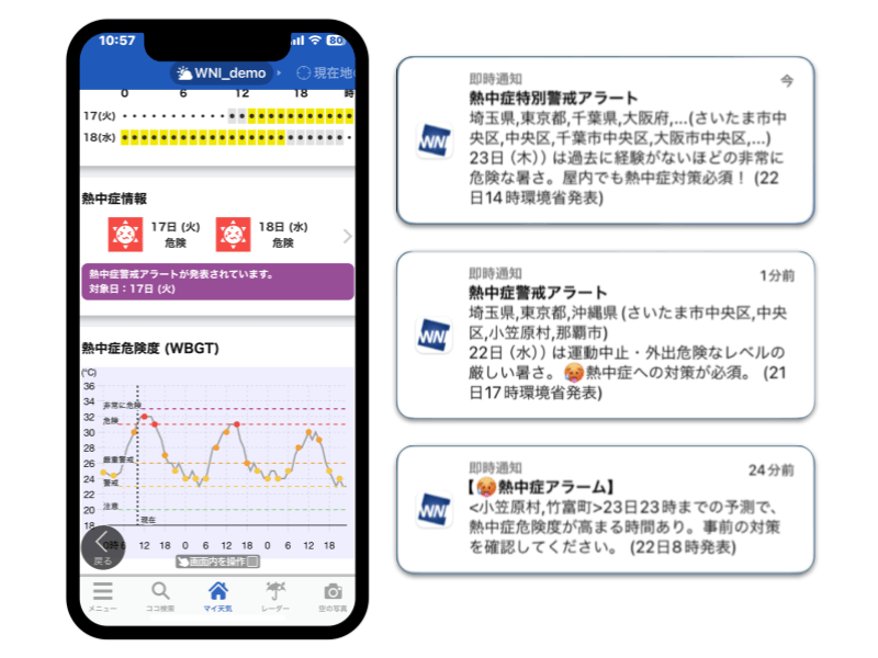 ウェザーニュース for businessのアプリ版では、熱中症のリスクが高まったときにプッシュ通知でお知らせする機能をご用意しています。