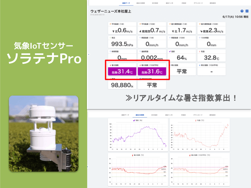 「ソラテナPro」は、雨・風・気温・湿度などの7つの気象要素を1分ごとに観測し、そのデータを元に暑さ指数(WBGT)を算出することで、現場の熱中症リスクを可視化するクラウドサービスです。