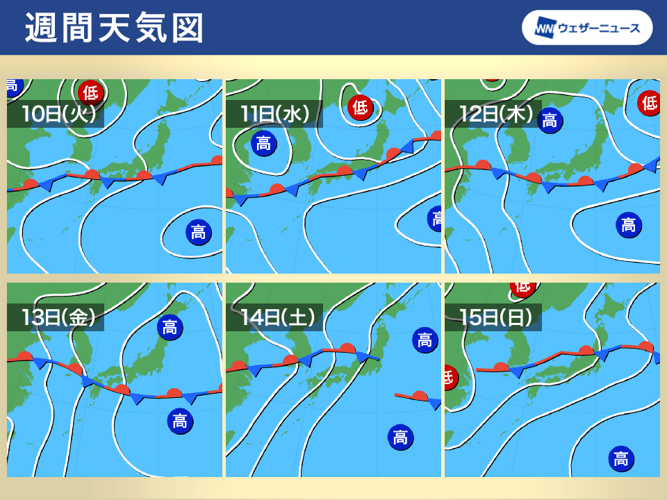 週前半は梅雨前線に向かって暖かく湿った空気が流れ込むため、前線の活動が活発になる予想です。特に11日(水)朝にかけては九州など西日本で断続的に強い雨が降り、大雨となるおそれがあります。最新の気象情報をこまめに確認するようにしてください。