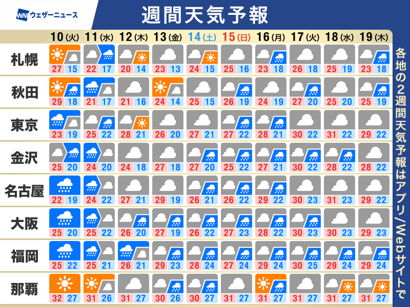 先週のカラッとした空気とは一変し、今週はジメジメ・ムシムシとした蒸し暑い体感になります。気温の変化はこの時期らしく、雨の降る日は最高気温が低めで、日差しが届くと高めになる予想です。湿度が高く熱中症の危険度も高まるため、こまめな水分補給や適度にエアコンを使用するなどの対策を行なってください。