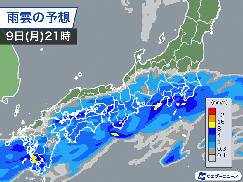 今日9日(月)は雨のエリアが東に広がり、近畿では昼頃から、東海は午後になって雨の降り出したところが多くなりました。関東も午後は沿岸部から雨の範囲が広がっています。紀伊半島では段々と雨が強まり、1時間に10mm前後のやや強い雨となっているところもあります。