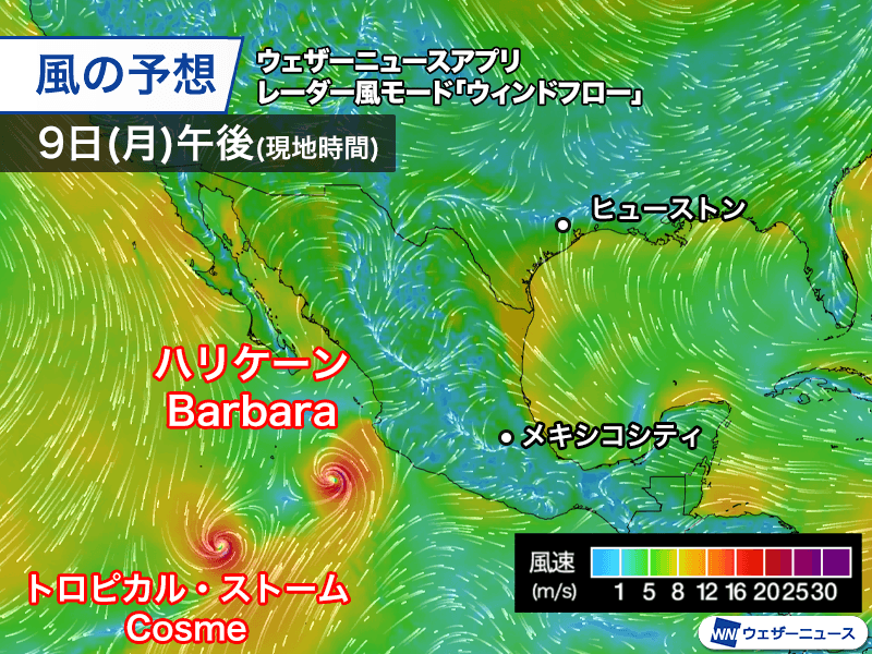 Barbaraは現地時間の9日(月)8時に中心付近の最大風速が35m/sに達し、ハリケーンとなりました。ハリケーンの発生は今シーズン初めてです。これ以上の発達はない見通しで、しばらくは勢力を維持しながら北西に進む予想となっています。