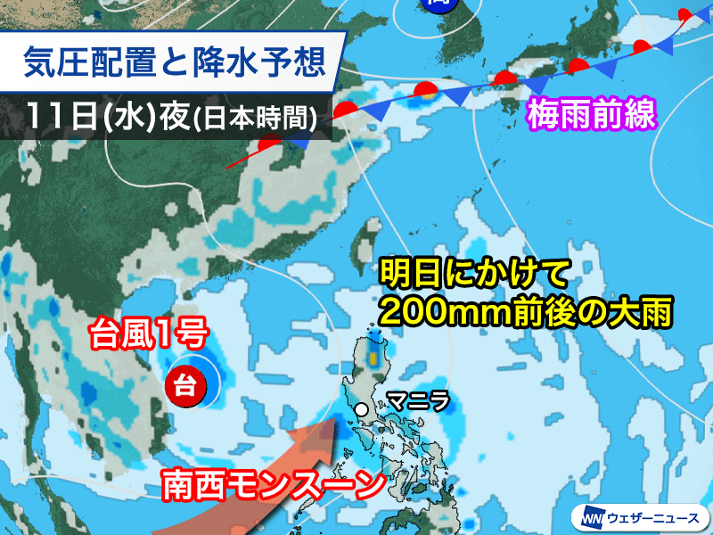 日本時間の今日11日(水)9時に南シナ海で台風1号が発生しました。台風の発生に伴って南西モンスーンが強まり、フィリピンのルソン島は断続的に非常に湿った空気が流れ込む見込みです。