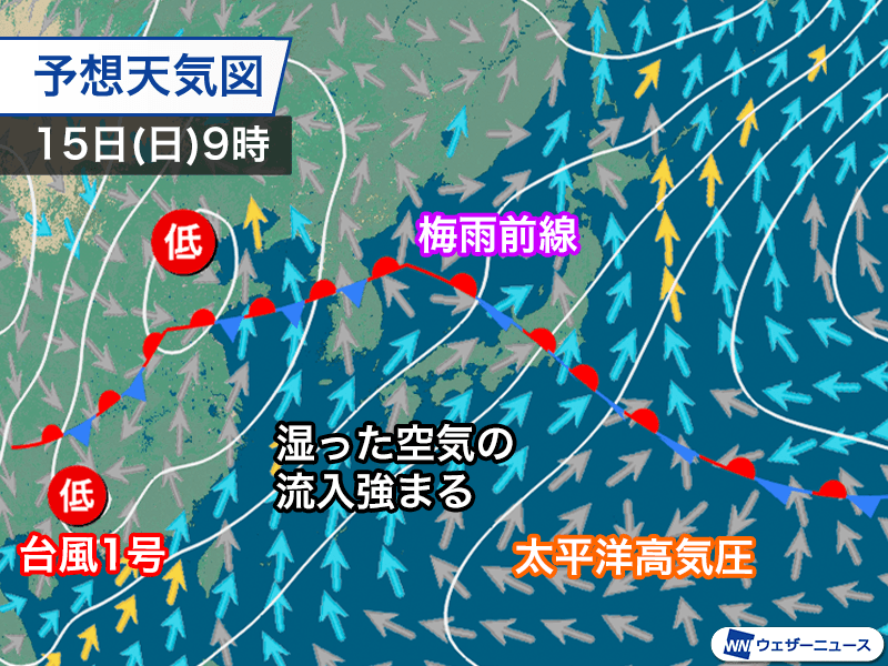 梅雨前線の南側に張り出す太平洋高気圧と、中国大陸に上陸が予想される台風1号との間で気圧差が大きくなり、南西からの湿った空気の流入が強まります。前線に近い西日本の日本海側や北陸では雨が強まる見通しです。