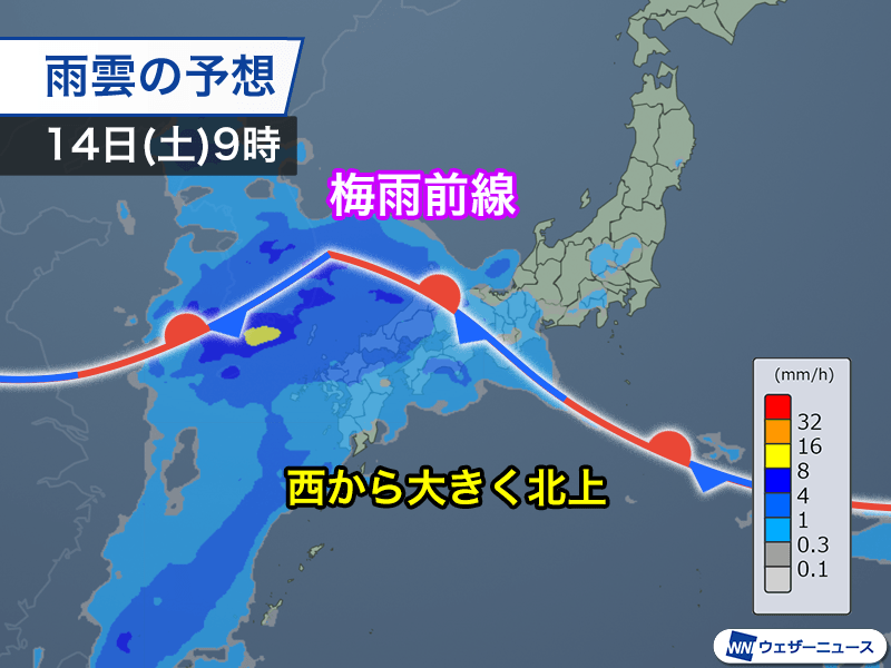 14日(土)になると梅雨前線は西から大きく北上し、朝の時点では日本海から紀伊半島付近を通って、関東の南の海上に伸びる予想となっています。