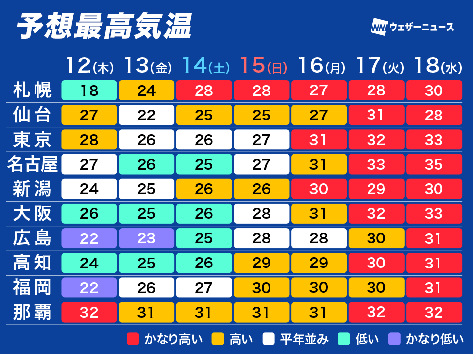 主要都市の最高気温を見ると、14日(土)頃までは雨の降る所が多いため平年並みか平年よりも低めの所が多くなります。15日(日)頃からは平年よりも高いエリアが拡大し、17日(火)、18日(水)は全国のほとんどの所が平年よりかなり高い予想です。