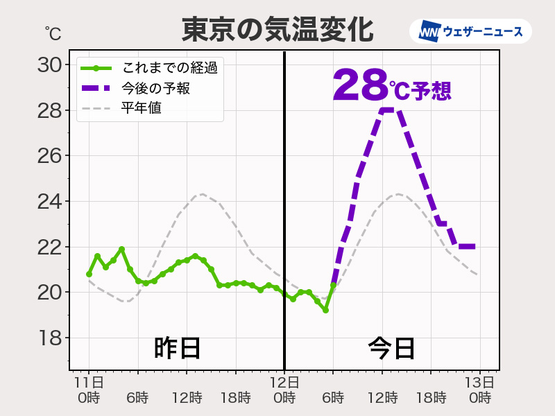 予想最高気温は東京やさいたまで28℃、千葉や横浜で27℃の予想で、昼間は半袖で過ごせる暑さです。