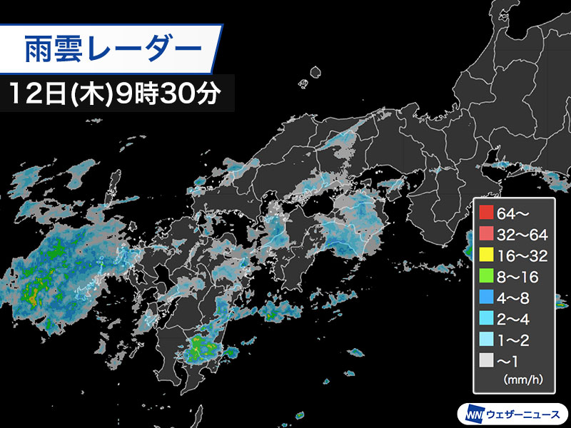 九州付近に停滞する梅雨前線の影響で、九州や中国四国の西部では未明から今朝にかけて雨のエリアが拡大しています。