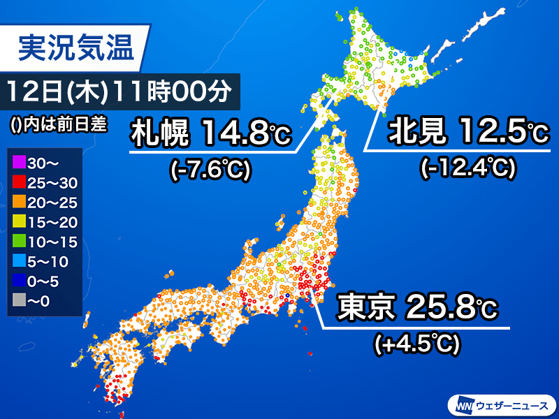 一方、気温の上昇が鈍いのが北海道です。札幌の気温は前日より7.6℃低い14.8℃、北見では12.4℃も低い12.5℃に留まっています。北海道を通過した低気圧が東の海上に離れたことにより、冷たい北風が吹き付けている影響です。