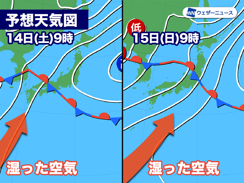 15日(日)は梅雨前線がさらに北上し、北陸から関東付近にかかる予想です。雨のエリアもさらに拡大し、西日本や東日本に加えて東北でも雨が降るとみています。まだ梅雨入りしていない東北地方ではこのタイミングで梅雨入りする可能性があります。