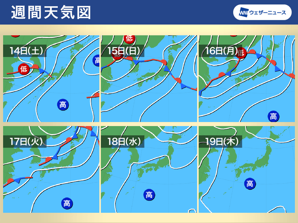 14日(土)から15日(日)にかけては、西日本から東日本の広い範囲で雨が降ります。九州を中心に東、西日本では強雨や大雨のおそれもありますので、前線の動向など今後の情報にご注意ください。