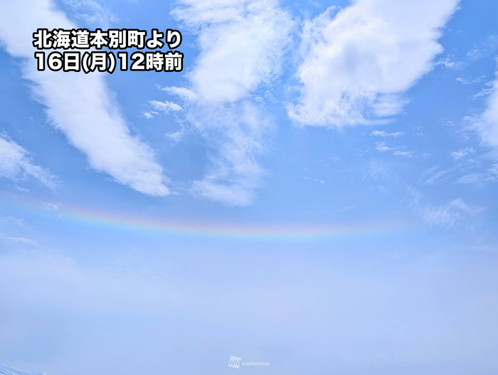 日本海から接近する前線の影響で上空の湿度が高くなり、薄い雲が広がって環水平アークが出現したと考えられます。前線の接近に伴って午後はだんだんと雲が厚みが増し、道南や道央では昼過ぎ以降に雨が降り出す予想です。