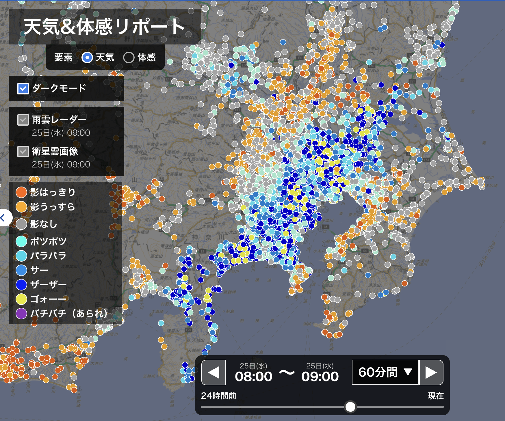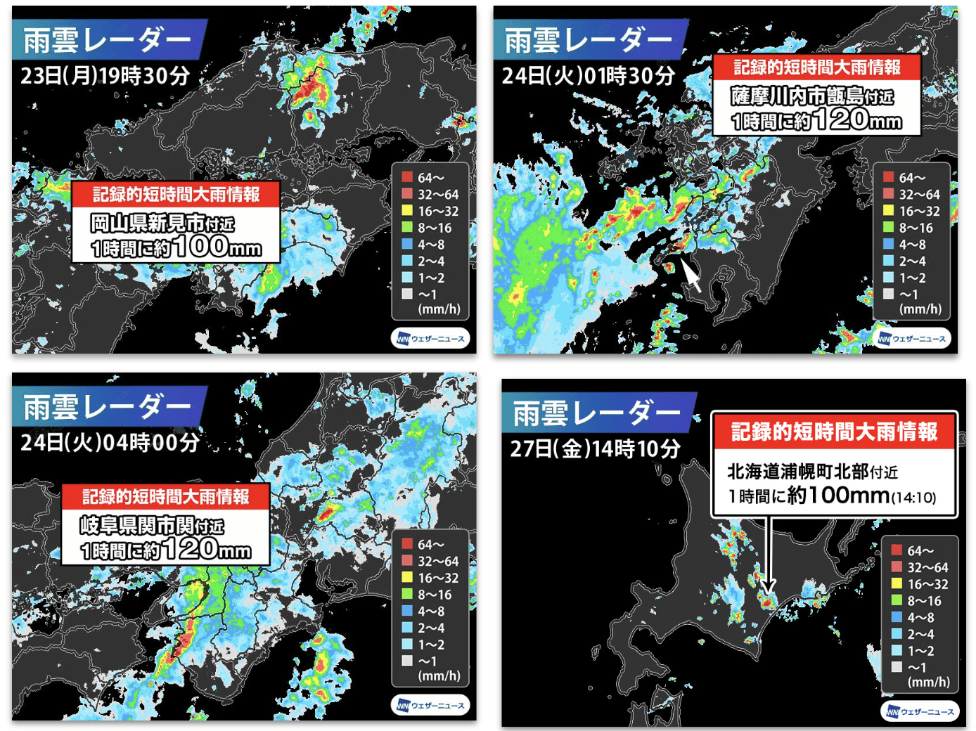 23日(月)夜間から24日(火)早朝にかけて、活発な雨雲が局地的にかかり、岡山県、鹿児島県、岐阜県に記録的短時間大雨情報が発表されました。
