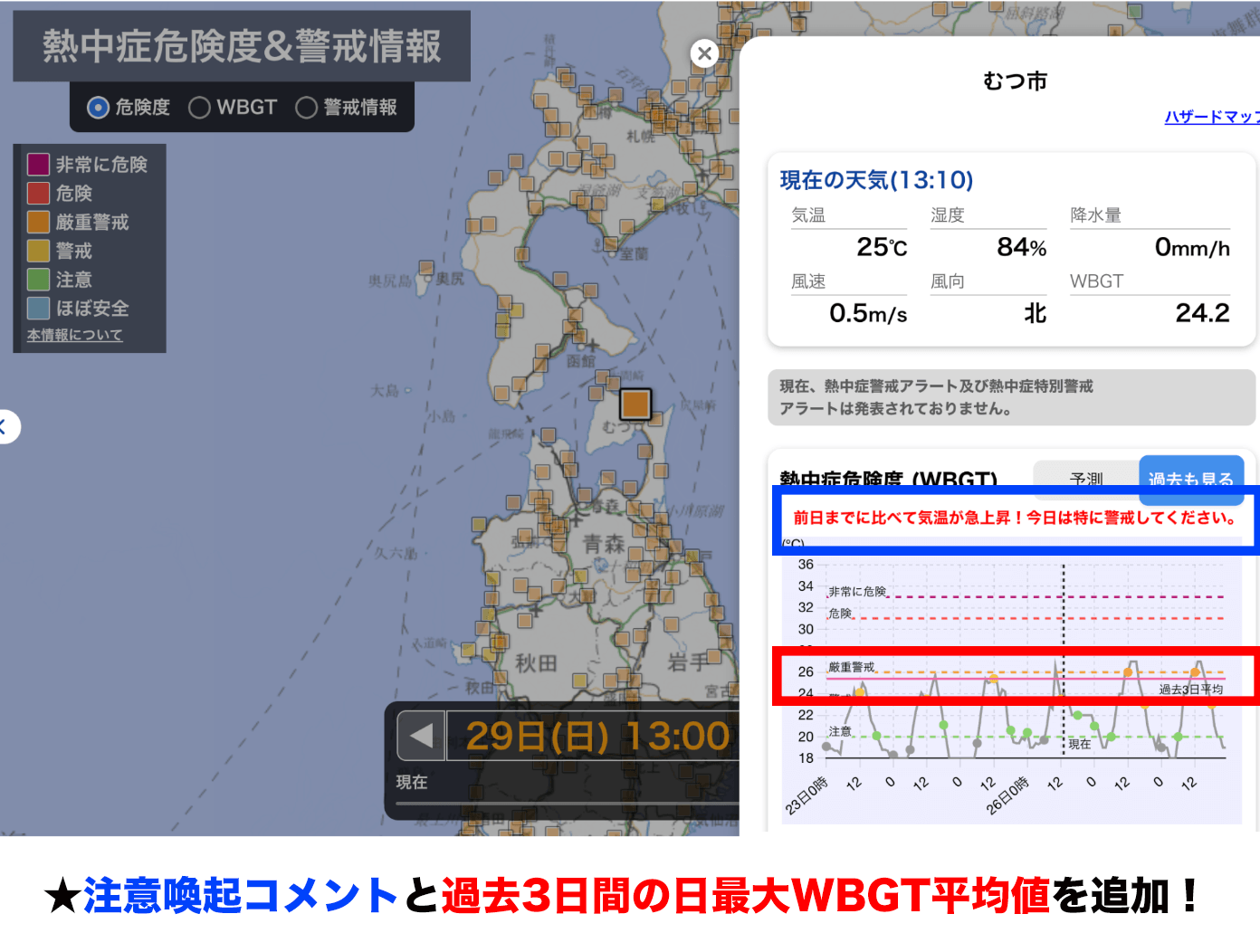 今回のアップデートにより、各拠点のWBGTグラフにて「過去3日間の日最大WBGTの平均値」が確認できるようになりました。また、過去3日間の暑さをふまえた、当日の熱中症リスクについての注意コメントも表示いたします。