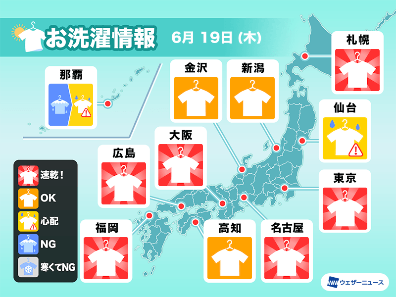 全国的に外干しOKのところが多く、日差しがしっかり届く所では洗濯物がカラッと気持ちよく乾きそうです。来週は梅雨空が戻る予想なので、梅雨の合間の貴重な日差しの活用がおすすめです。