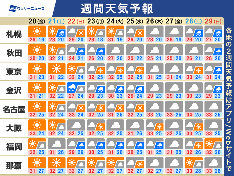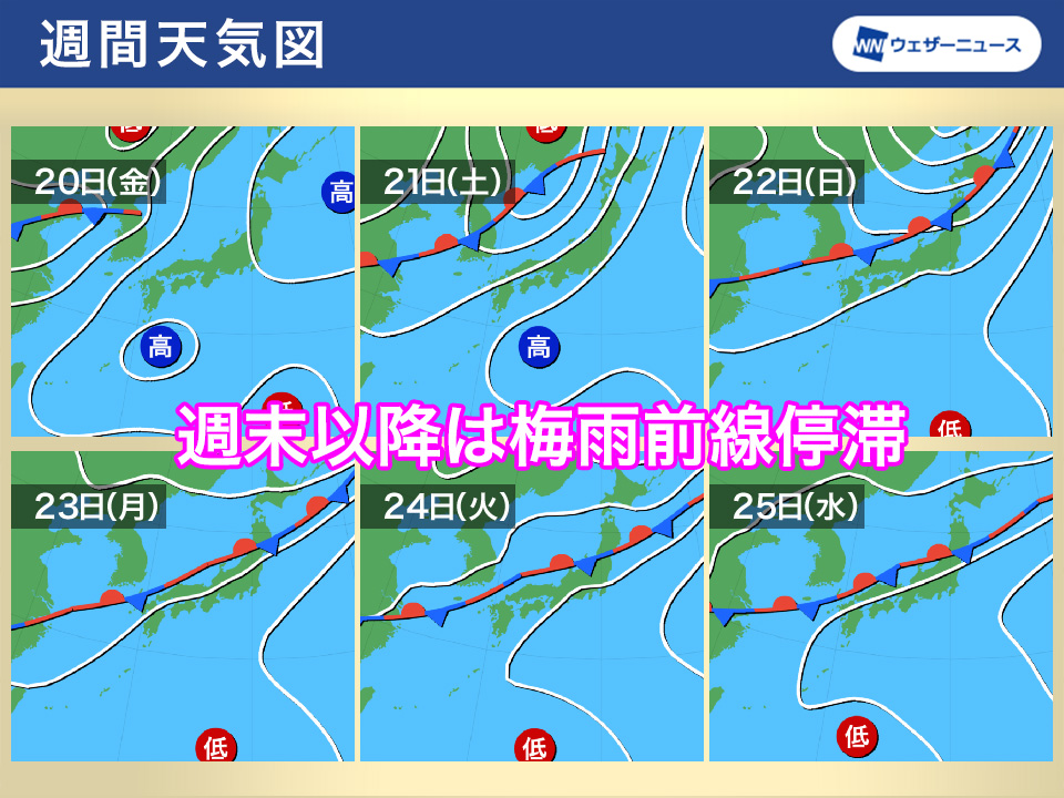 週末以降は梅雨空に戻り、雨や曇りの日が多くなる見込みです。ただ、湿度が高く蒸し暑さは解消されないため、熱中症には引き続き注意してください。