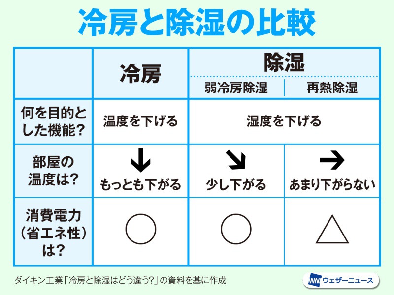 弱冷房除湿は弱めの冷房と同じく温度を少し下げてくれるので、暑くて湿気も気になるときに有効です。