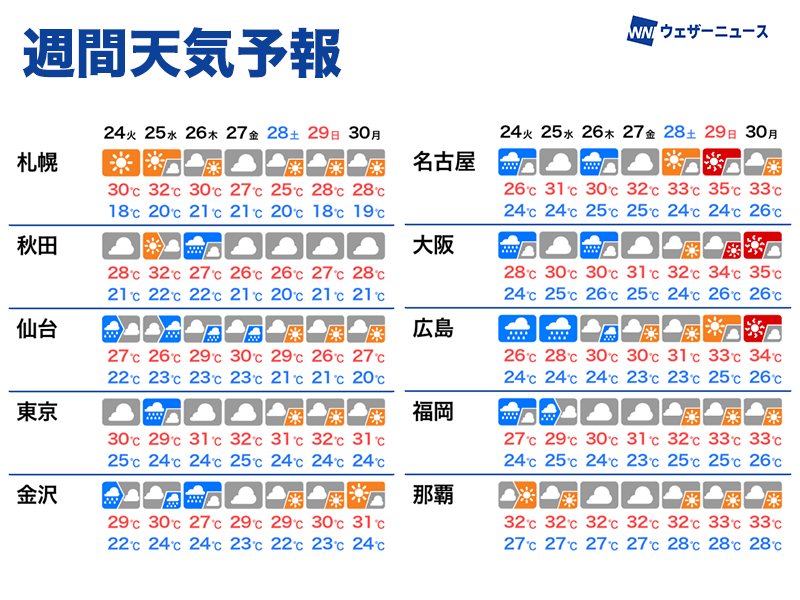 前線の南側となる九州から関東は最低気温も高めで、一日を通して暑さ対策が必須です。こまめな水分補給や塩分補給で脱水症・熱中症予防を意識的に行ってください。