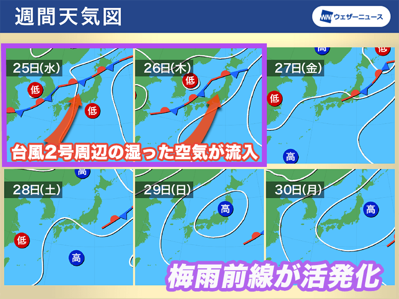 週中頃まで強まる雨に注意 梅雨前線に台風2号の影響も