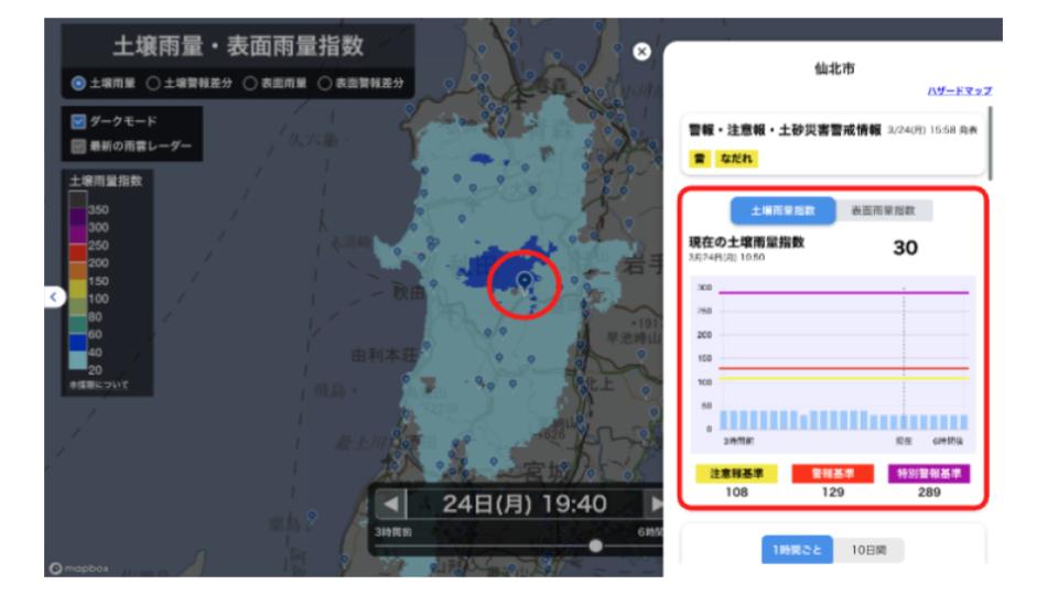 あらかじめ登録いただいた拠点をクリックすると、指数の推移が確認できます。過去分は3時間前まで10分ごと、予測は1時間ごと6時間先までご確認いただけるため、どのタイミングで警報が出る可能性があるのか、あるいは警報の解除がいつ頃になりそうかを把握し、最適な体制構築の判断へご活用いただけます。