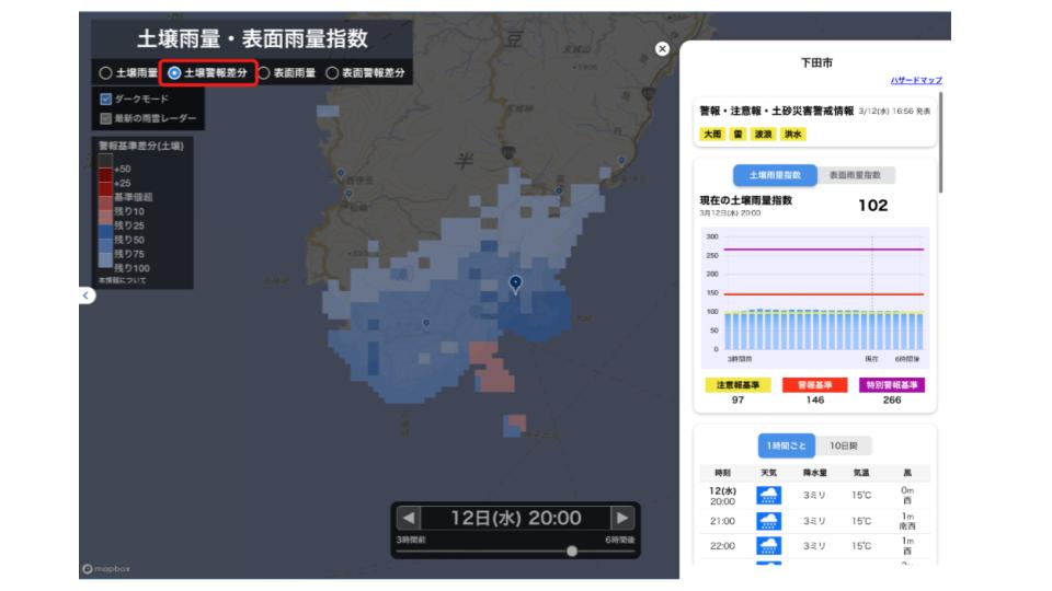 >>気象庁の大雨警報・注意報の土壌雨量指数基準値(1km四方)はこちら