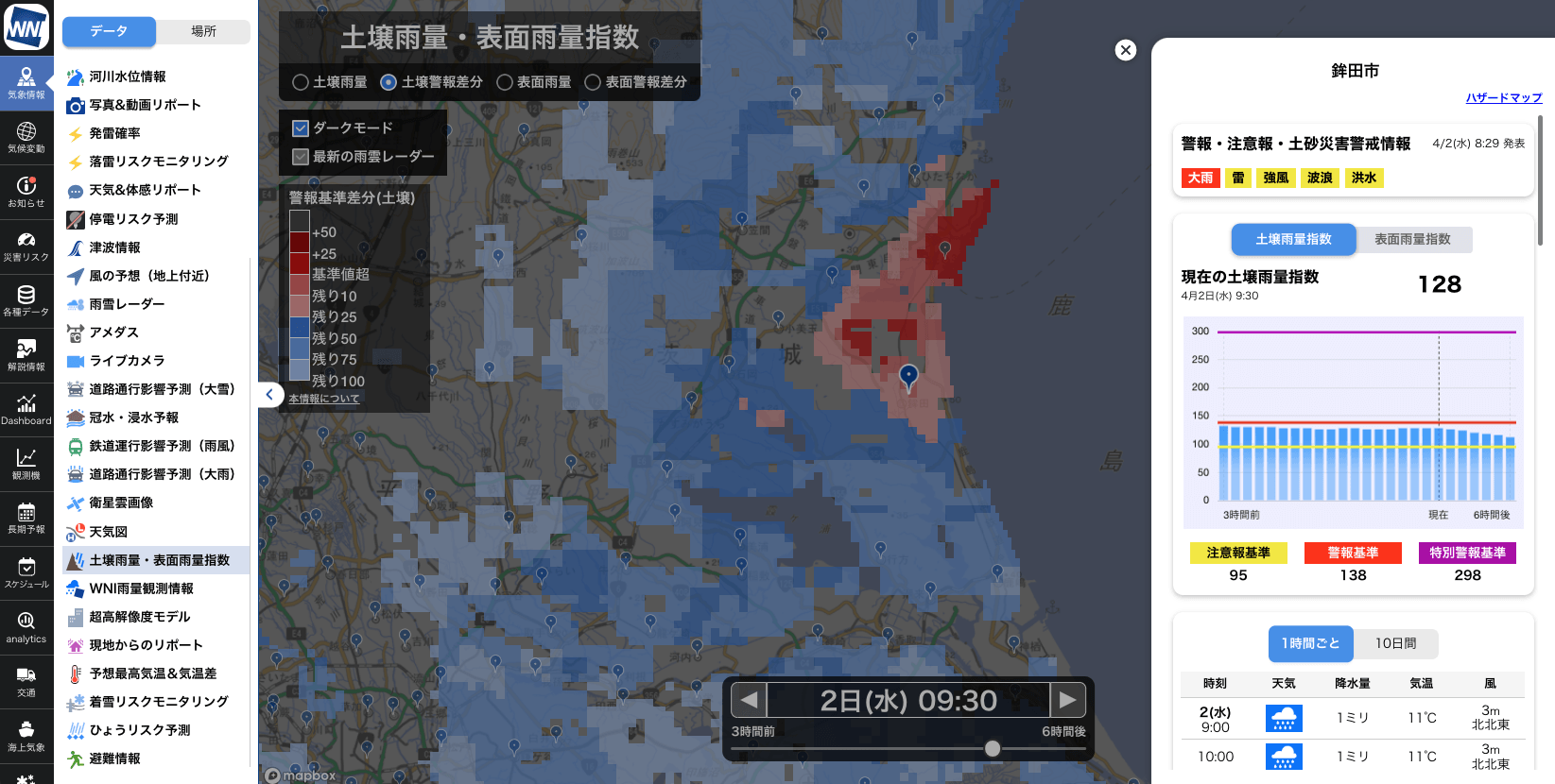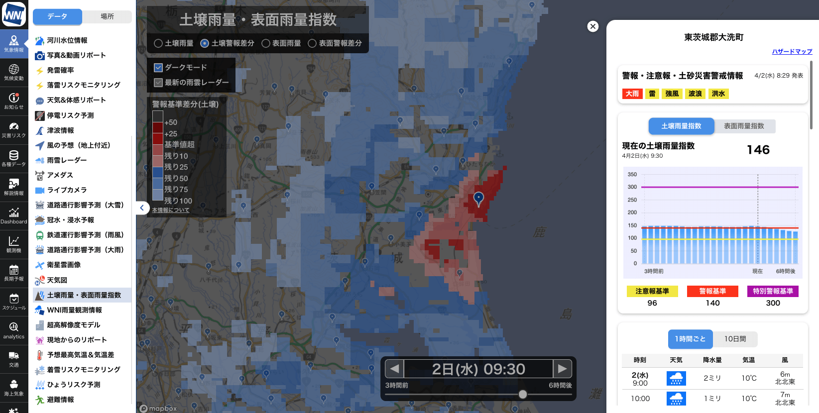 ウェザーニュース for businessの「土壌雨量・表面雨量指数」のメニューでは、気象庁が発表する大雨警報の基準となる土壌雨量指数・表面雨量指数と、それぞれの警報基準に対しての切迫度を見ることができます。