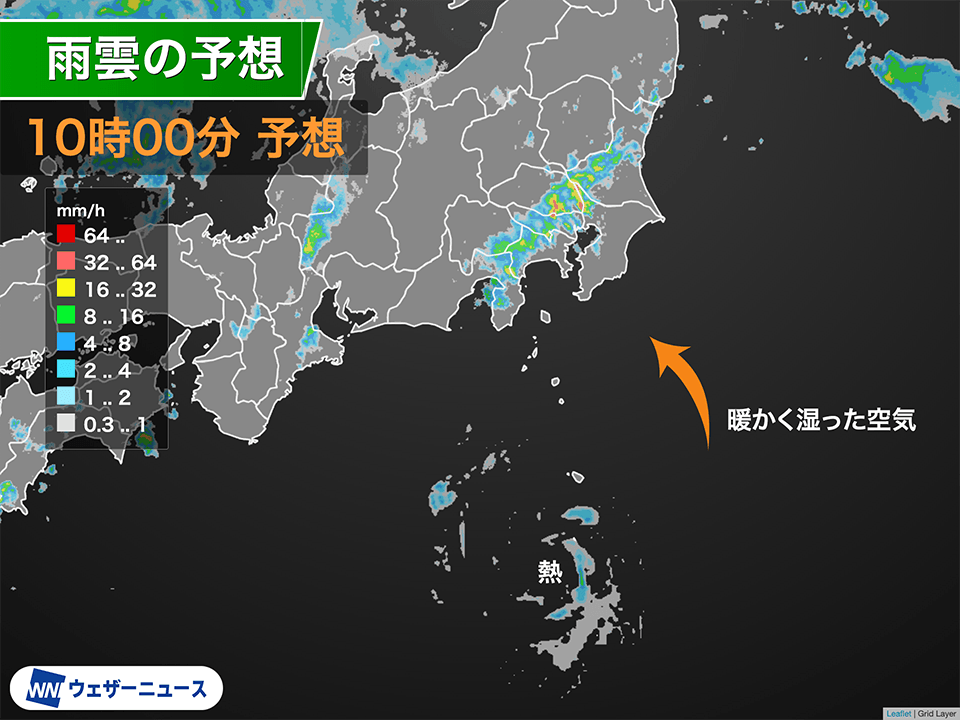 一方、この熱帯低気圧周辺の暖かく湿った空気が東日本方面に流れ込んで、本体の接近前から雨雲が発達しています。関東では熱帯低気圧の通過後にかけて、大気の状態が不安定な状況が続きますので、急な激しい雨や落雷等に注意してください。