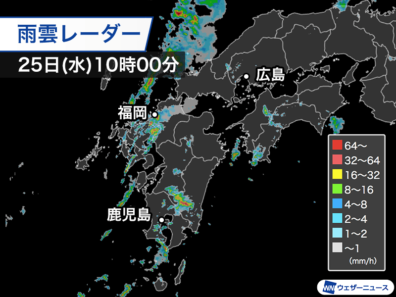雨雲全体としてはゆっくりと東進していて、九州では午後にかけても断続的に強雨が予想されます。また、中国地方でも雨が強まる見通しです。