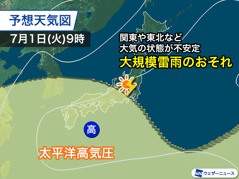関東や東北も週末以降は高気圧に覆われやすくなります。太平洋高気圧が西日本方面に張り出すため、東日本の上空には湿った空気が流れ込み、大気の状態が不安定になる見込みです。