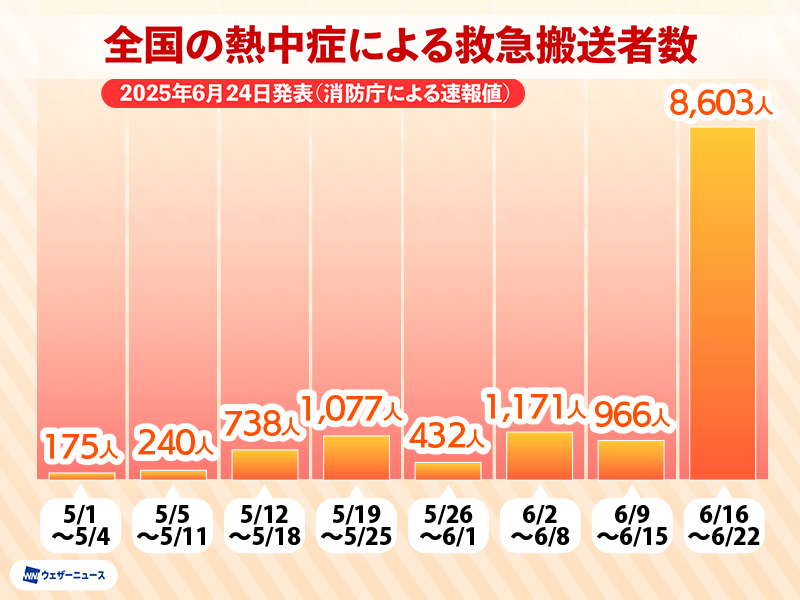 この1週間の中では6月17日(火)の搬送者が最も多く1793人となりました。当日は上空に夏の暖かい空気に覆われ、名古屋で初めて猛暑日を観測するなど、関東甲信や東海、東北南部を中心に6月中旬としては記録的な暑さとなりました。また16日(月)以降のWBGTは「厳重警戒」を示す28以上となり、熱中症による救急搬送者数が増加したことが考えられます(26日環境省発表)。