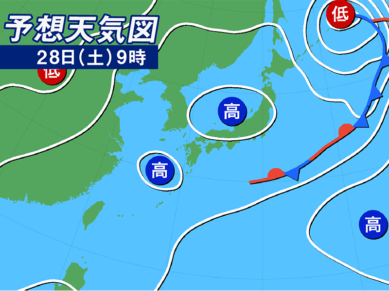明日28日(土)は、太平洋高気圧が勢力を強める影響で、晴れるところが多くなる予想です。西日本から東日本の太平洋側では猛暑レベルの厳しい暑さが予想されています。