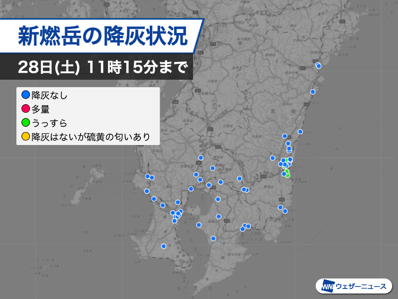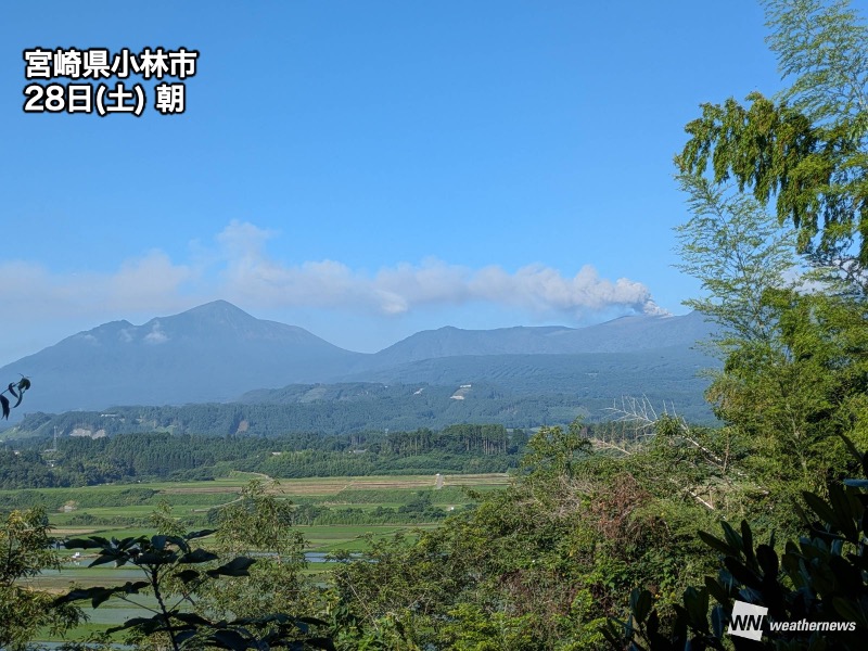 昨日27日(金)朝からは連続噴火により継続的に噴煙を上げていて、今日9時までの噴煙の最高高度は火口上800mと気象庁は発表しています。噴煙量は少量ですが、南東方向(22日と比べると南寄り)に流れています。