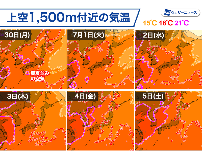 上空の強い暖気に日照も加わることで、東北から九州の広い範囲で予想最高気温が連日30℃を上回り、内陸部を中心に35℃以上の猛暑日になる日もあるとみられます。