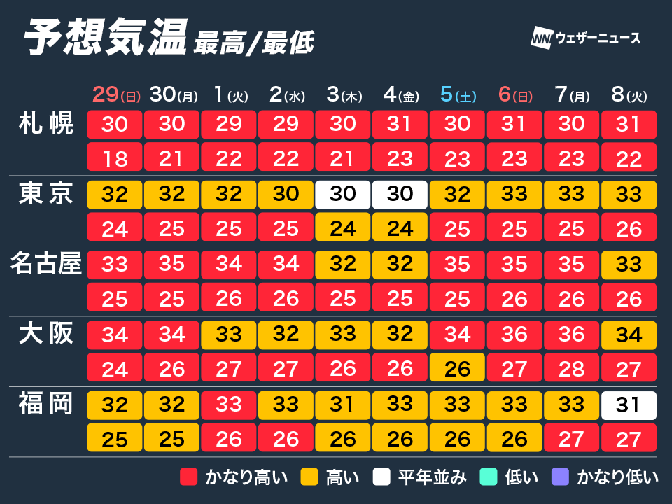 最低気温も高く、東海から西日本では25℃以上の熱帯夜が続く見込みです。