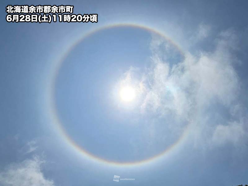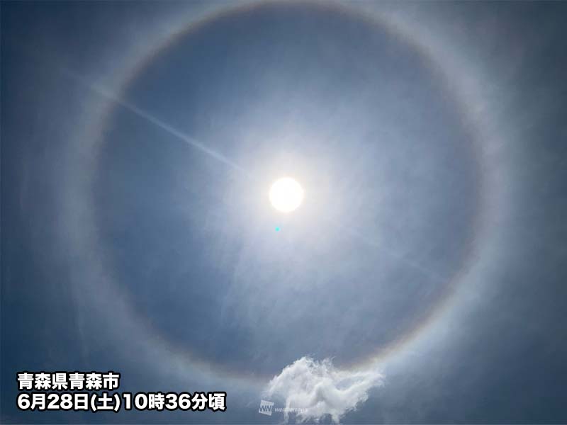 北海道や東北北部では、上空の高い所を吹くジェット気流に対応して発生した薄雲がかかっています。この薄雲は氷の粒で構成されており、氷の粒によって太陽光が内側に曲げられ、光の強い部分が環状に見られています。