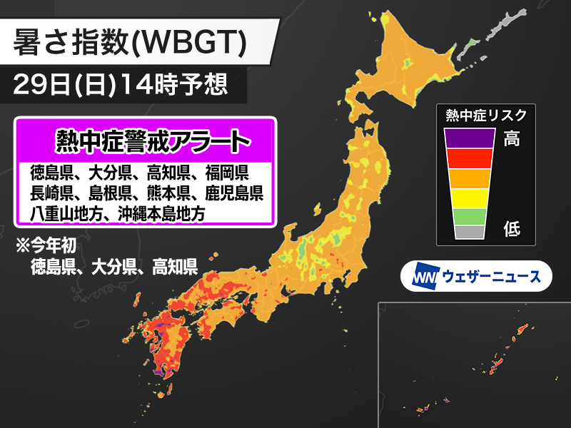 明日6月29日(日)の熱中症警戒アラート 徳島県など3地域が今年初 全10地域に発表