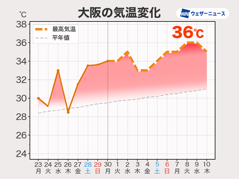 各地で昼間は30℃以上の真夏日となり、内陸部や都市部でも35℃以上の猛暑日になるところがある見込みです。