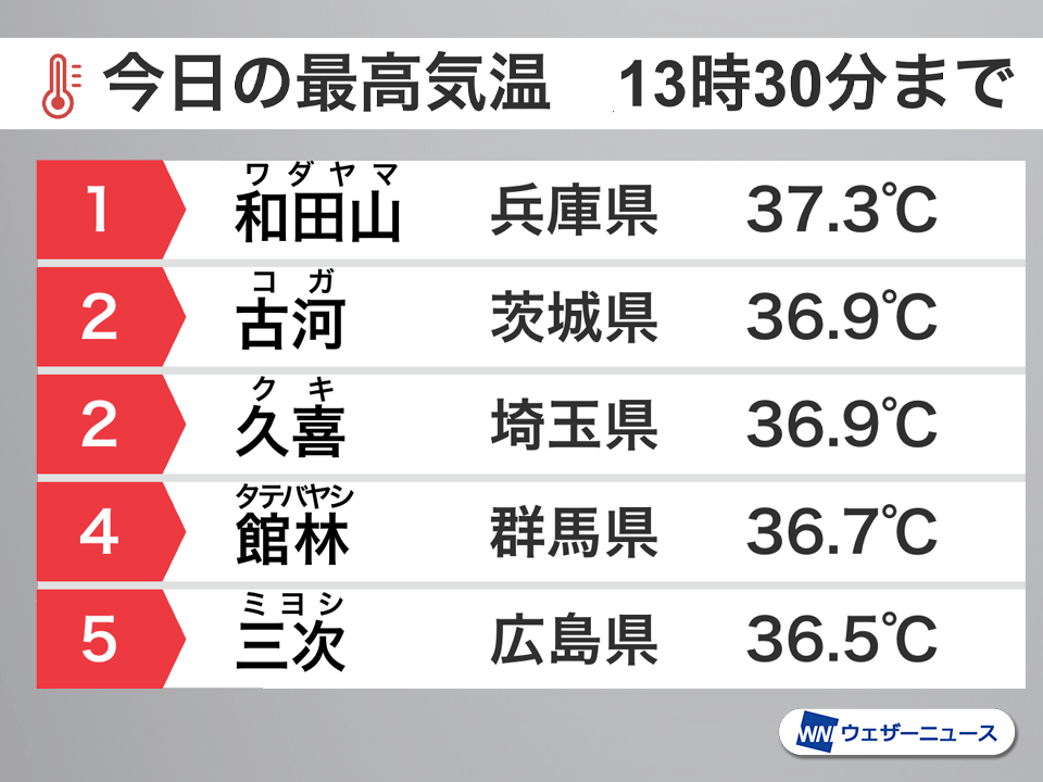 最も気温が上がっているのは兵庫県朝来市・和田山で37.3℃、茨城県古河市と埼玉県久喜市で36.9℃、群馬県館林市で36.7℃など体温並みの暑さです。名古屋市でも35.6℃まで上がって、11日ぶりの猛暑日になりました。