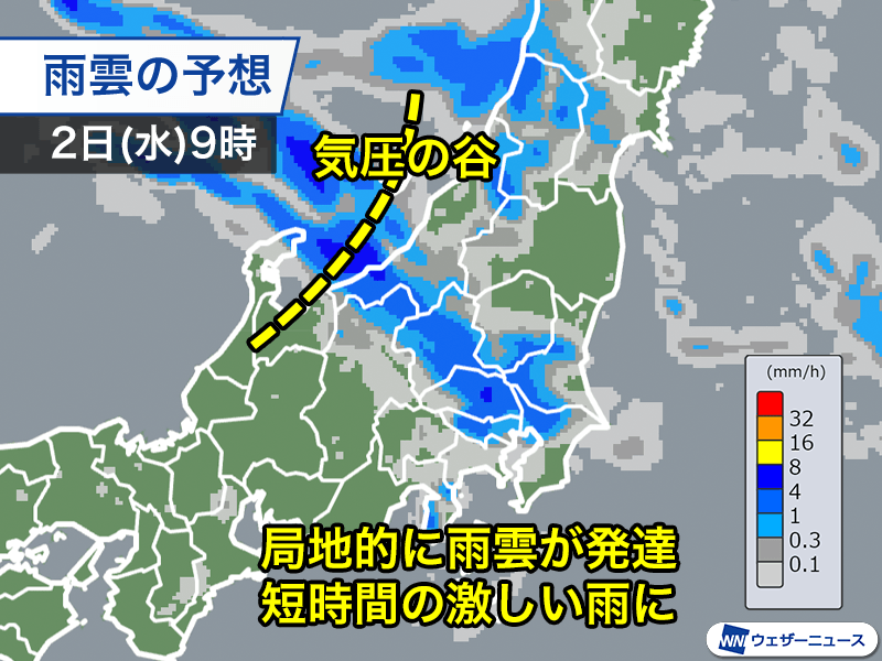 上空の気圧の谷が通過することに加え、地上付近ではシアーライン(風の流れが変化する境界線)が形成されるため、午前中から雨の降る所がある見込みです。明日よりも早いタイミングで雨の降り出す所があり、気圧の谷が海上に抜ける夕方にかけて局地的に雨雲が発達するとみられます。