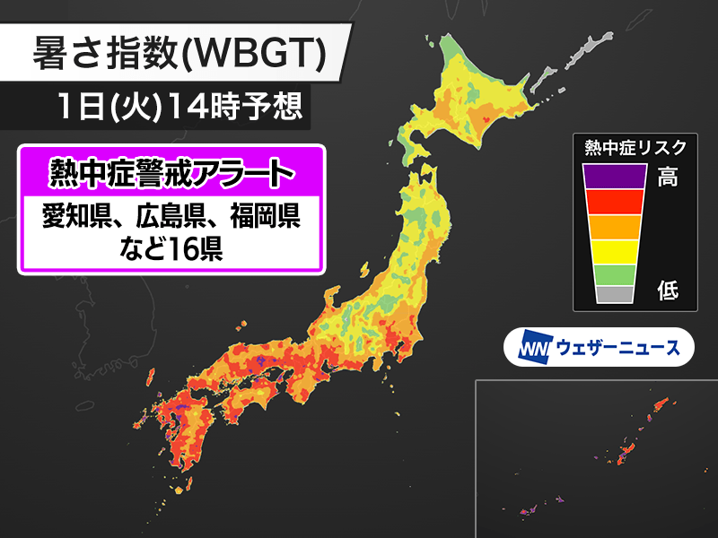 明日1日(火)も西日本から東海は太平洋高気圧に覆われ、強い日差しが照りつけて気温が上がります。熱中症警戒アラートの対象地域では暑さ指数(WBGT)も高くなり、熱中症のリスクが上昇するところがあるので、エアコンをつけたり、こまめな水分補給・塩分補給を行うなどの対策をしっかりと行ってください。十分な睡眠と栄養補給も熱中症予防の基本です。